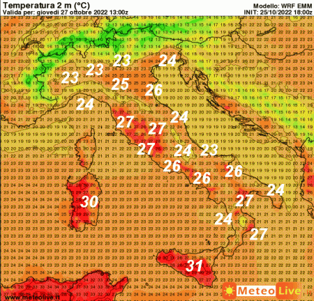 Dal punto di vista termico saremo su valori semplicemente allucinanti per il periodo in questione. Ecco cosa si prevede alle ore 15 di domani, giovedi 27 ottobre: