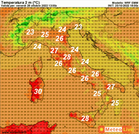 La giornata forse più critica potrebbe essere venerdi 28 ottobre. Ecco le temperature previste sempre alle ore 15: