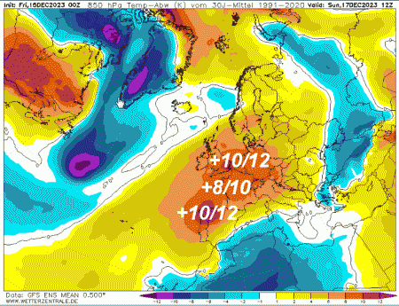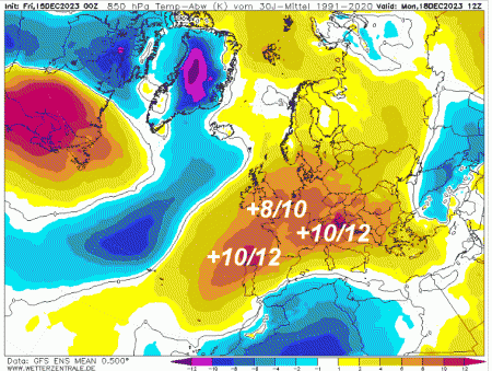 Su buona parte dell’Europa centro-occidentale avremo anomalie termiche al rialzo comprese tra 10 e 12°. Tra 8 e 10° sul nord Italia e parte delle regioni centrali.
