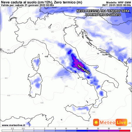Ma quanta neve effettivamente cadrà? Possiamo già da ora escludere l’arrivo della neve su coste e pianure, eccezion fatta per qualche sporadico fenomeno in pianura in Abruzzo nel week-end o su Emilia e Piemonte ad inizio prossima settimana. Saranno le quote collinari e montuose gli obiettivi delle forti nevicate. Già da oggi si prospettano vere e proprie tormente di neve su Abruzzo, Lazio, Molise, Campania, Basilicata e Calabria settentrionale. Le quote varieranno dai 400-500 metri dell’Abruzzo ai 700-800 metri dalla Calabria settentrionale.