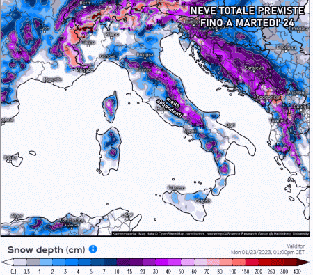 Fino a 60-80 cm di neve sul monti tra Basilicata, Campania, Lazio, oltre i 1000-1200 metri di quota. Tanta neve attesa anche su Pollino e Sila oltre i 1300 metri (anche fino a mezzo metro). Nevicate abbondanti su Aspromonte e oltre i 1400 metri della Sicilia con accumuli superiori ai 40-60 cm.