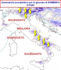 La cartina a lato inquadra la sommatoria delle precipitazioni attese in Italia tra le 8 e le 20 della giornata odierna (DOMENICA).