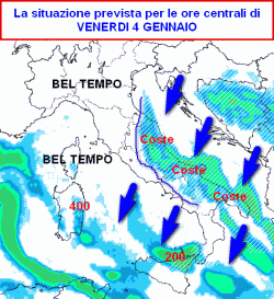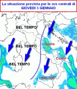 La prima mappa mostra la situazione prevista in Italia per le ore centrali di giovedi 3 gennaio.