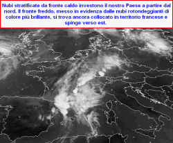 L’avvicinamento del cavo d’onda al Mediterraneo ha provocato durante la nottata la formazione di un fronte caldo che attualmente sta investendo la nostra penisola a partire da ovest. Questi addensamenti persisteranno per tutta la giornata odierna che di conseguenza sarà caratterizzata, almeno al nord, da una generale variabilità senza precipitazioni di rilievo.