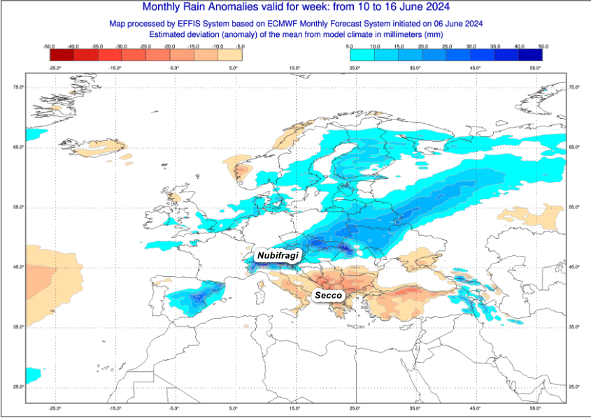 Passiamo ora al quadro delle anomalie pluviometriche attese in Europa sempre nel lasso temporale compreso tra il 10 e il 16 giugno: