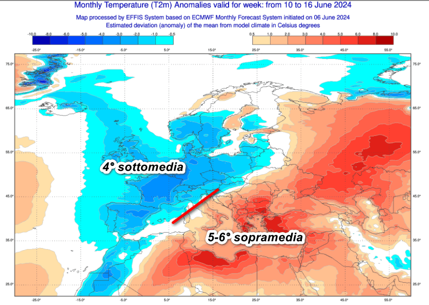 Questa mattina, il prestigioso centro di calcolo ECMWF ha aggiornato la linea tendenziale del tempo in Europa per la seconda settimana di giugno, da lunedi 10 a domenica 16 giugno. La prima mappa mostra le anomalie termiche attese sul nostro Continente durante la settimana in parola:
