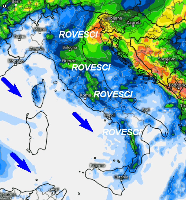Correnti assai più fresche entreranno da nord-ovest. I rovesci interesseranno tutti i versanti orientali e le aree interne del centro-sud dove saranno possibili anche temporali. Più sporadiche le precipitazioni al nord-ovest, lungo le coste tirreniche e sulle due Isole Maggiori.