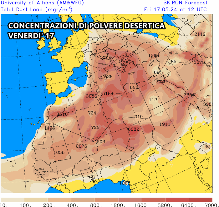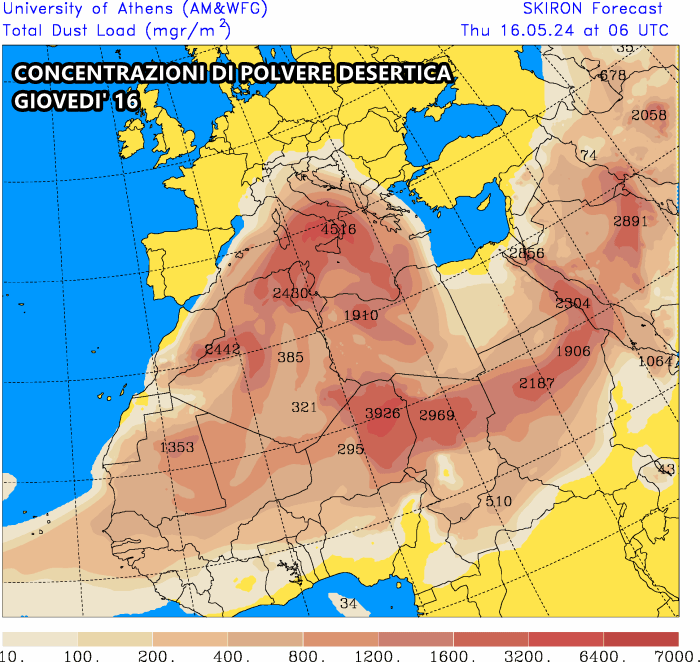 Secondo gli ultimi aggiornamenti dei centri di calcolo, è molto probabile che su gran parte del Sud Italia possiamo raggiungere concentrazioni fino a 4500 microgrammi su metro quadrato di polvere desertica. Il momento clou è atteso tra mercoledì, giovedì e venerdì, quando gran parte del centro Sud Italia si ritroverà con cieli sporchi e lattiginosi a causa di queste nubi di polvere che naturalmente potranno dar luogo anche a piovaschi isolati ed acquazzoni che inevitabilmente sporcherebbero ogni genere di superficie.
