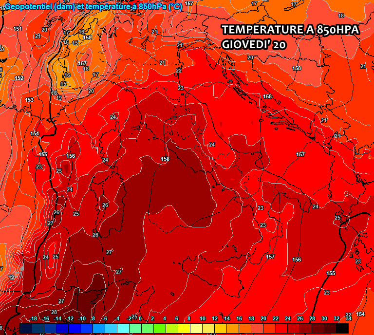 Andando più nel dettaglio si può notare che le temperature a 850hpa rischiano di essere addirittura più alte su alcuni settori: in Sardegna spuntano isoterme di circa 26 e 27°C (sempre a circa 1.500m), che poi si manifesterebbero anche lungo l’Appennino centro-meridionale entro venerdì. Insomma il caldo diverrebbe decisamente intenso e a tratti insopportabile, considerando che a quote di pianura e nelle valli la temperatura potrebbe salire anche oltre i 39-40°C.