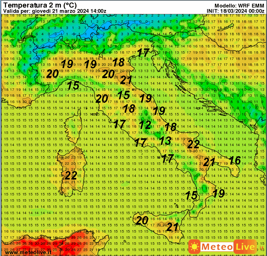La seconda mappa mostra le temperature attese in Italia alle ore 15 di giovedi 21 marzo: