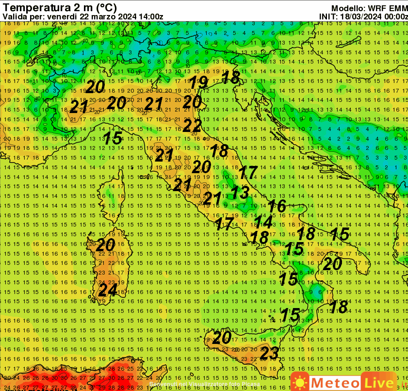 La giornata più “calda” pare essere venerdi 22 marzo. Ecco i valori delle temperature massime attese in Italia sempre attorno alle ore 15 della giornata medesima.