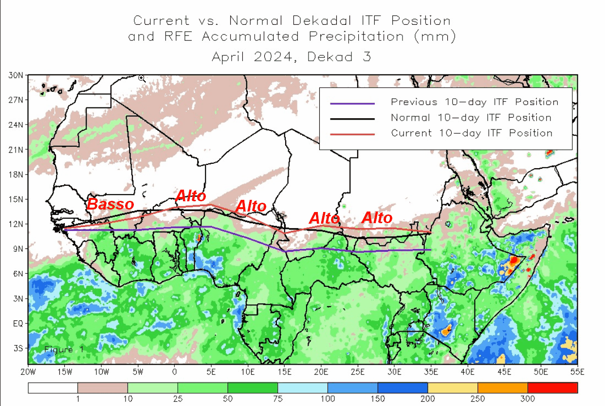 L’ITCZ non viene monitorato in inverno, ma sale sugli altari della cronaca già a partire dal mese di aprile per i motivi suddetti. La mappa ce lo mostra così come è disposto in questi ultimi giorni, o meglio come era disposto nella TERZA DECADE DI APRILE. La linea scura rappresenta la sua altezza media, mentre la linea rossa la posizione assunta dal 20 AL 30 APRILE.