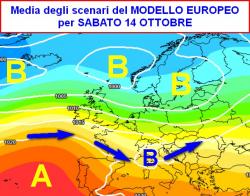 In altre parole, qualche passaggio perturbato dovrebbe essere garantito quantomeno al nord e al centro. Anche la media ens prevista per sabato 14 ottobre (seconda mappa) opta per un ingresso veloce di corpi nuvolosi da ovest anche se un po’ "disturbati" dall’alta pressione Iberica.