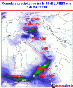 La prima cartina che abbiamo preparato inquadra le cumulate precipitative attese in Italia tra le 19 di lunedì e le 7 di martedì.