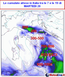 La seconda cartina inquadra le cumulate precipitative attese in Italia tra le 7 e le 19 di martedì 28 gennaio.