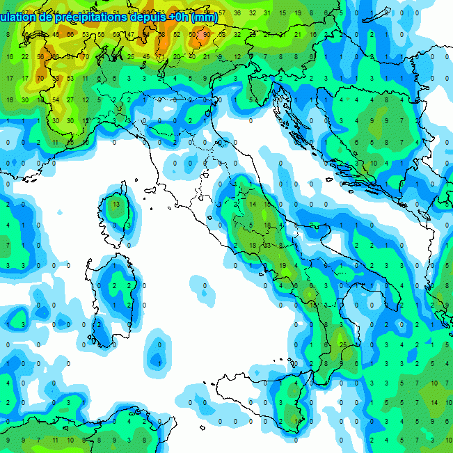 Il modello nostrano si differenzia non poco dal collega americano. Secondo questo elaborato, le piogge più intense si concentreranno al nord-ovest e sulle due Isole Maggiori, oltre ai settori alpini ed in parte alle aree interne appenniniche del centro. Su tutte le altre regioni si prevedono piogge scarse o poco probabili.