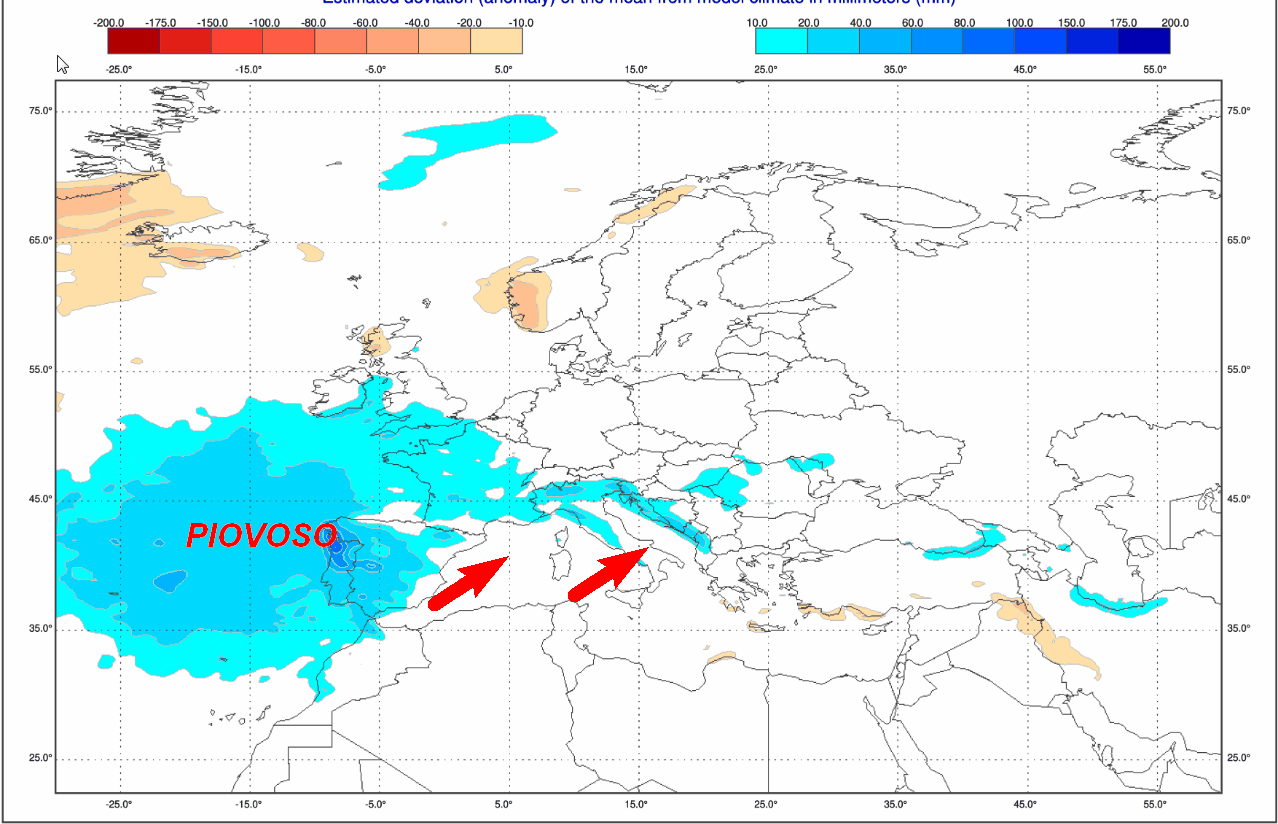 Infatti, se andiamo ad analizzare le anomalie pluviometriche attese per il mese di marzo a scala europea ed italica, notiamo quanto segue: