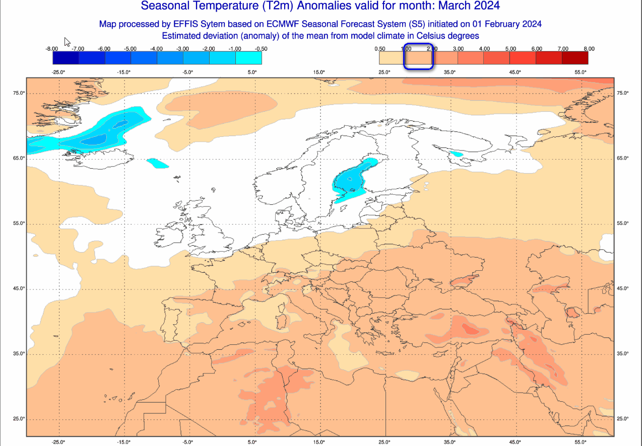 Sul fronte termico cosa potrebbe succedere? La mappa delle anomalie termiche a scala europea previste per l’intero mese di marzo ci dice che la temperatura potrebbe essere più alta del normale, ma non di molto: