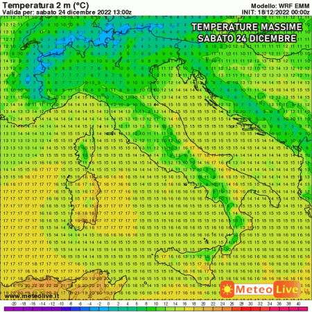 Che temperature raggiungeremo? Ancora presto per dirlo con certezza, ma le regioni del sud e le isole (specie la Sardegna) potrebbero sfiorare temperature vicine ai 16-17°C, con qualche picco di 19°C nelle ore centrali della vigilia ed anche nel giorno di Natale.