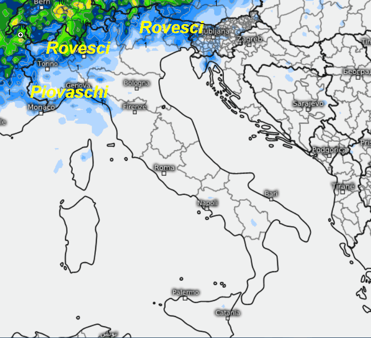 Piovaschi probabili sulla Liguria, sulle Alpi, con rischio di sconfinamenti verso le aree di pianura adiacenti. Sul resto d’Italia tempo stabile ed anche abbastanza caldo specie a sud e sulle Isole.