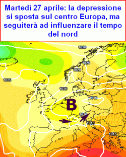 Martedì 27 la depressione si sposterà sul centro Europa ma il nostro settentrione seguiterà ad essere interessato da infiltrazioni di aria più fresca ed instabile, foriera di rovesci o brevi temporali pomeridiani, specie a ridosso dei rilievi, un po’ di variabile impegnerà anche le