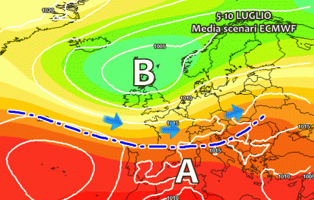 Ancor meno incisivo in termini di caldo la media degli scenari del modello europeo ECMWF. L’alta pressione prevista tra 5 e 10 Luglio è ancor più debole e facilmente minacciata da incursioni fresche atlantiche che darebbero luogo a tanti rovesci e temporali, principalmente al nord.