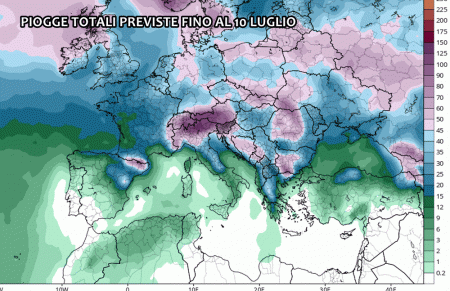 Tutta questa instabilità che potrebbe palesarsi nel corso della prima decade di Luglio prende forma nella mappa degli accumuli di pioggia previsti fino al giorno 10 del mese. Eloquenti gli accumuli totali al nord, specie a ridosso dei monti, dove si prospettano oltre 90-100 mm di pioggia. Man mano che ci si sposta verso sud gli accumuli si riducono sempre più grazie alla maggior azione dell’anticiclone.