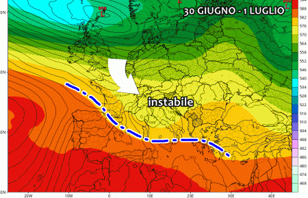 Questa dinamicità sarà tangibile già durante questo week-end, sin da venerdì 30 Giugno. Una perturbazione organizzata proveniente da nord-ovest attraverserà l’Italia a suon di piogge e temporali intensi.