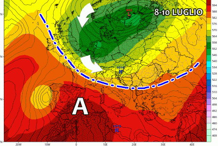 Spingendoci un po’ più in là comincia a intravedersi un altro peggioramento quasi esclusivamente per il nord tra 8 e 10 Luglio. Un vasto nucleo fresco proveniente dal nord Europa potrebbe lambire il settentrione dove scatenerebbe nuovi forti temporali. Il sud potrebbe invece ritrovarsi sotto l’anticiclone ed un aumento delle temperature.
