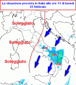 La prima mappa mostra la situazione prevista in Italia per le ore centrali di lunedi 25 febbraio.