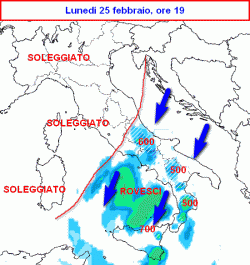 La seconda mappa mostra la situazione attesa in Italia nella serata di lunedi 25 febbraio (attorno alle 19-20).