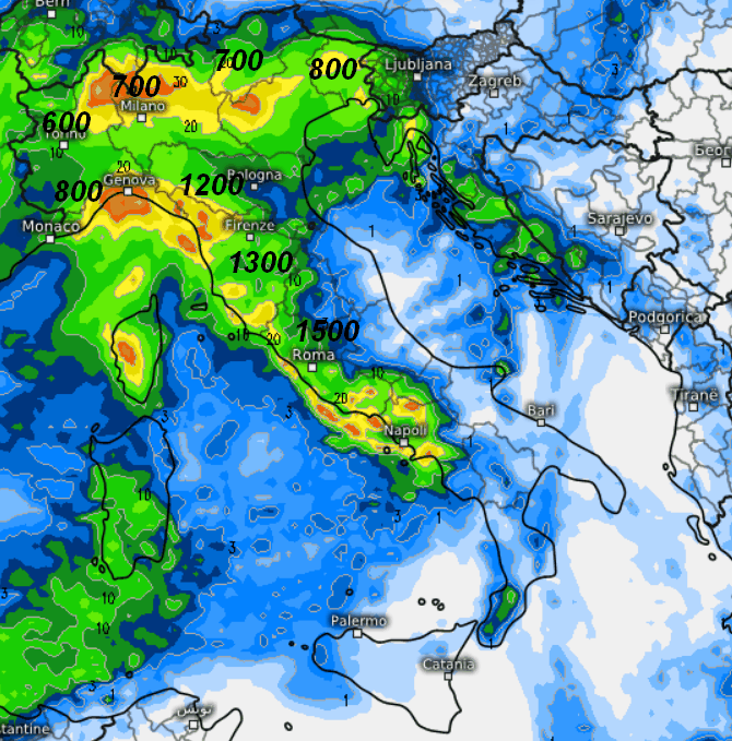 Oltre alle piogge ed ai rovesci che interesseranno praticamente tutto il nord, il Tirreno, parte della Sardegna e le aree interne, notiamo la quota neve che al settentrione potrebbe collocarsi tra i 600 e gli 800 metri; tra i 1200 ed i 1300 metri la medesima quota sull’Appennino settentrionale e 1400-1500 su quello centrale. Fenomeni assenti lungo il versante adriatico e su gran parte del meridione ad eccezione della Campania che avrà invece molti rovesci.