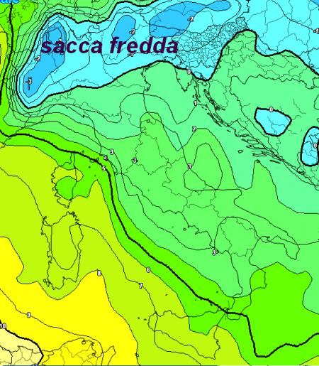 Anche dopo il passaggio del piccolo vortice di martedì 28 affluirà aria più fredda e secca sul catino padano, favorevole al mantenimento di una sacca d’aria fredda in grado di favorire eventi nevosi, come vediamo nella mappa qui sotto.