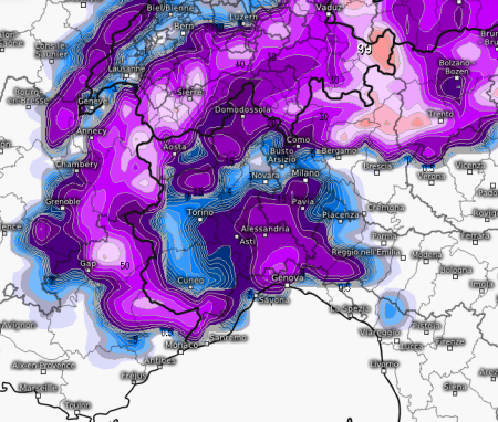 Ed è per questo che all’arrivo del fronte vero e proprio, previsto per venerdì 1° dicembre, solo un modello crede ancora in condizioni favorevoli ad un episodio nevoso in pianura, peraltro relegato al nord-ovest e ai fondovalle alpini, è quello canadese (GEM) che vi mostriamo qui sotto (in azzurro e viola la neve):