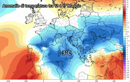In definitiva, dalle medie degli scenari possiamo riscontrare una previsione di anomalie negative su tutta la penisola. Nel periodo tra 12 e 17 Maggio si prevedono temperature inferiori alle medie praticamente ovunque, localmente anche di 3-4°C sotto la media.