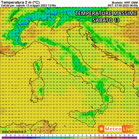 Di seguito vi mostriamo, indicativamente, le possibili temperature massime di sabato 13 Maggio, a testimonianza del presunto netto calo delle temperature: