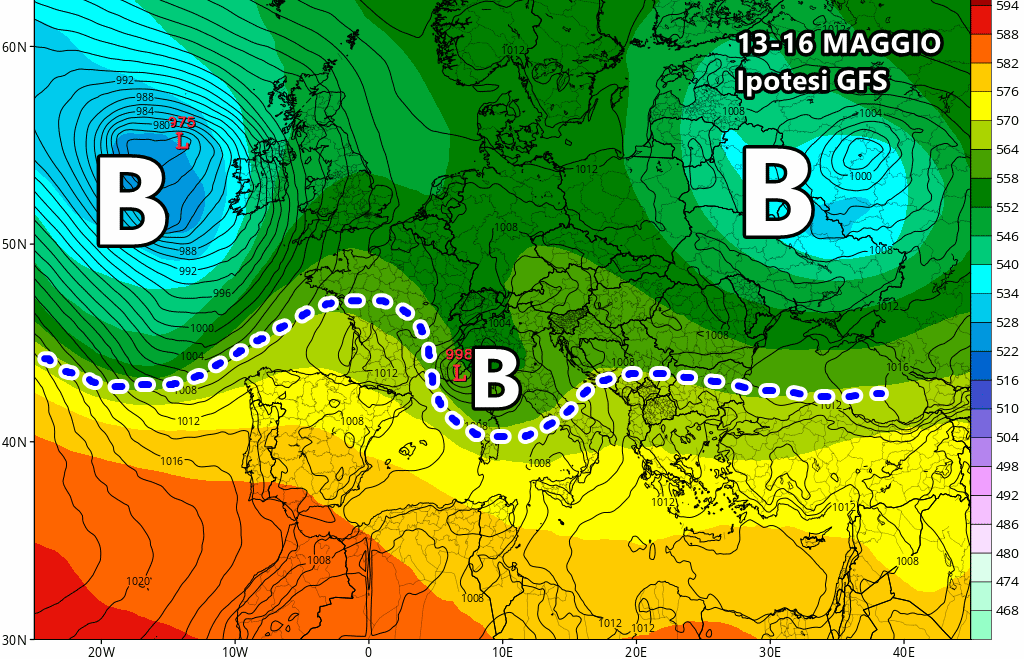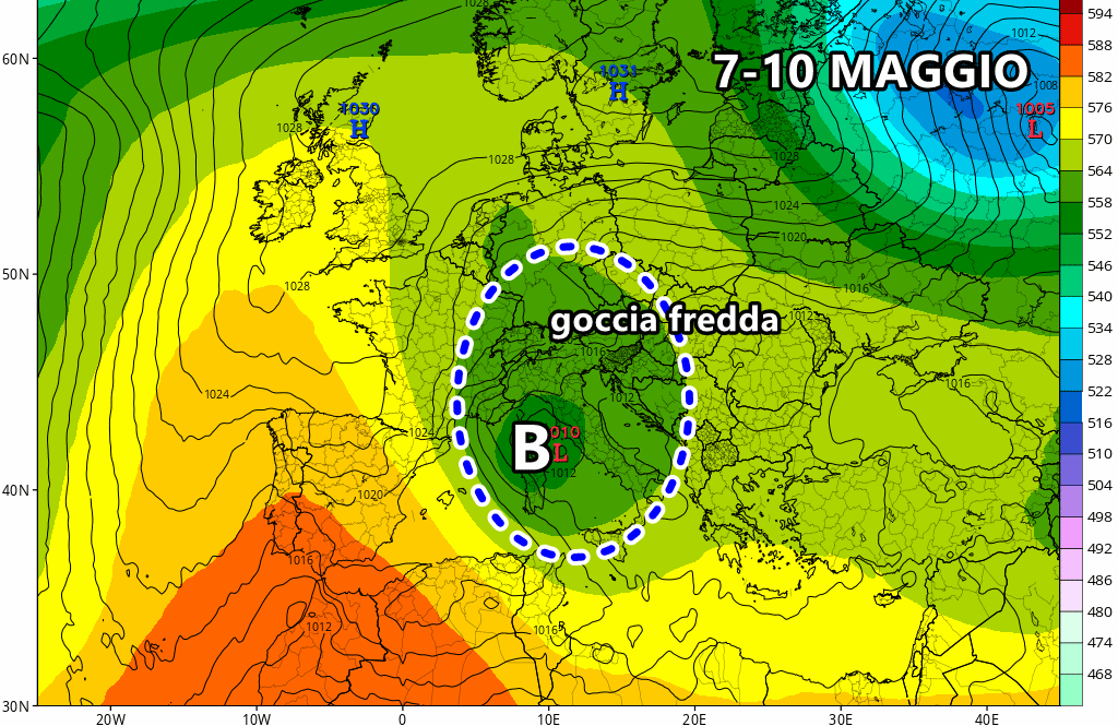È ormai confermato che la prossima settimana faremo i conti con una massa d’aria più fredda, isolata in alta quota, che riuscirà ad attraversare tutta Italia causando diversi giorni di tempo molto incerto e instabile. Questo nucleo freddo potrebbe arrecare non solo un calo termico di diversi gradi, ma anche tanti temporali localmente intensi, capaci di generare grandine di grosse dimensioni, locali nubifragi e forti raffiche di vento. Trattandosi di temporali è chiaro che avremo a che fare con fenomeni intermittenti, con accumuli variegati da nord a sud. Tuttavia, questi fenomeni tenderanno a svilupparsi principalmente nelle aree interne, quelle collinari e quelle montuose e pertanto sarà proprio su questi settori che avrà una maggior probabilità di precipitazioni nei prossimi 10 giorni. Discorso a parte per il fronte occluso di questa area di bassa pressione che potrebbe arrecare piogge più diffuse ed estese soprattutto tra l’8 e il 9 maggio sulle regioni del Medio Basso Adriatico e al sud.