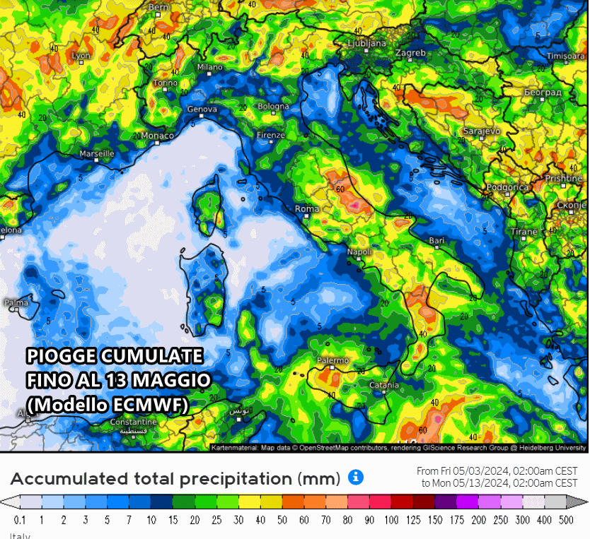 Anche il collega europeo ECMWF mostra precipitazioni interessanti per i prossimi 10 giorni (fino al 13 Maggio):