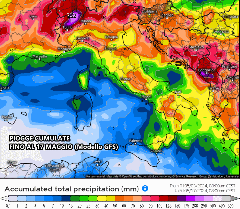 Passata questa perturbazione, potremmo imbatterci in un paio di giorni di tranquillità e di clima un po’ più mite, dopodiché l’instabilità potrebbe nuovamente fare la voce grossa su gran parte d’Italia. Gli ultimi aggiornamenti dei modelli matematici propongono un nuovo peggioramento attorno a metà mese a partire dal Nord Italia e in questo caso faremo i conti con tanti temporali molto intensi a rischio nubifragi a partire dal nord-ovest. Eloquenti le piogge totali previste dal modello americano GFS fino al 17 Maggio, frutto di varie perturbazioni che transiteranno nel Mediterraneo: