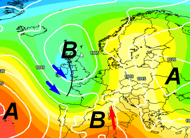 Osservate la saccatura sull’Europa occidentale che invierà aria umida da sud-ovest in direzione della nostra Penisola, in modo particolare al nord e al centro. In altre parole, il tempo tenderà a peggiorare su questi settori con elevato rischio di rovesci e temporali specie sui settori alpini, prealpini, le alte pianure e le aree interne dell’Italia centrale. Al sud e sulla Sicilia avremo invece una maggiore stabilità accompagnata da temperature piuttosto elevate.