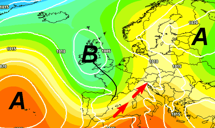 Le differenze con il “collega” americano sono minime. Anche il modello nostrano vede la presenza di una vasta saccatura sull’Europa centro-occidentale che coinvolgerà anche il settore centro-settentrionale della nostra Penisola, con condizioni di instabilità. Osservate anche l’aria calda (freccia rossa) che verrà prelevata dal nord Africa e farà aumentare le temperature al meridione e sulla Sicilia.