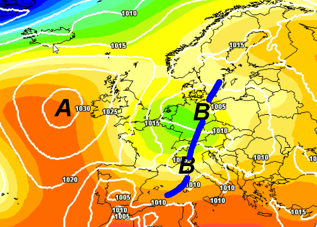 Il modello europeo per la medesima giornata, ovvero venerdi 31 maggio, mostra in sostanza la stessa congiuntura barica: