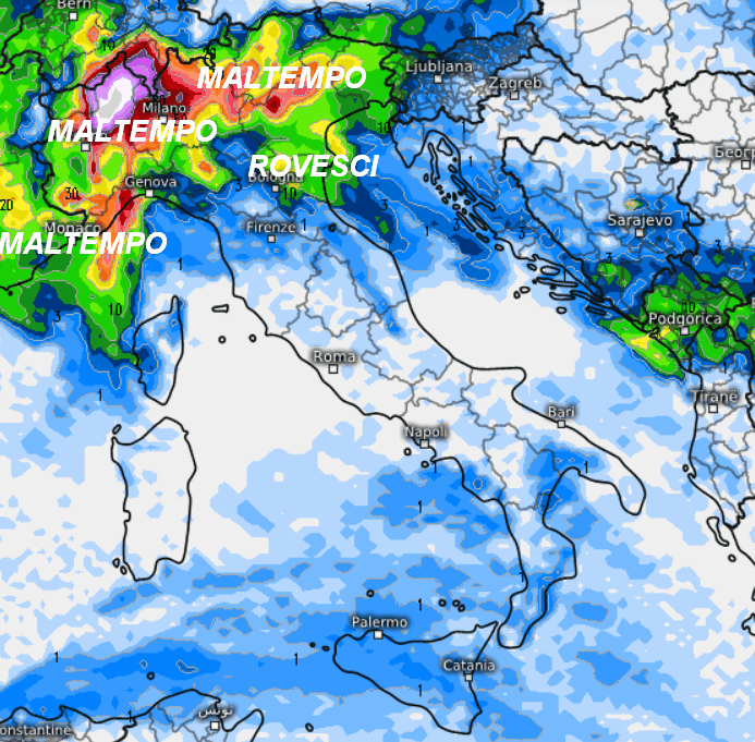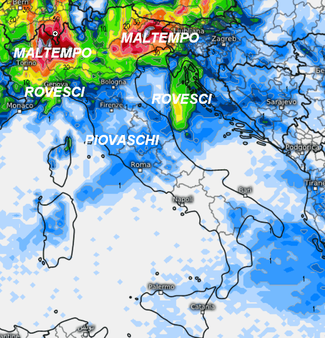 MASSIMA ATTENZIONE tra alto Piemonte, bassa Val d’Aosta ed alta Lombardia dove sono attesi accumuli piovosi di tutto rispetto. Stessa situazione tra alto Veneto, Trentino e Friuli…insomma, le aree che si troveranno a nord del Po. A sud del Po pioverà in misura minore anche se saranno possibili rovesci sulla Liguria centro-occidentale, ma senza criticità. Il resto d’Italia vedrà invece scorrere nubi medio-alte, in un contesto di cielo lattiginoso o sabbioso con qualche piovasco che potrebbe farsi vedere nelle aree interne del centro e sulla Toscana durante il pomeriggio.