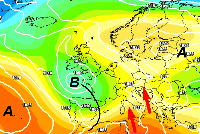 Notate la voragine barica presente sull’Europa centro-occidentale che invierà correnti umide meridionali verso la nostra Penisola (frecce rosse). Le regioni settentrionali e parte del centro si troveranno esposte a questo tipo di situazione ed avranno una fase di maltempo anche intenso. Al meridione invece sarà imminente una fase di caldo anomalo, con temperature ben oltre la media stagionale.