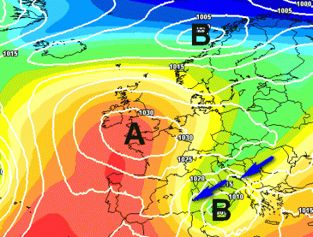 Le miti correnti oceaniche saranno bloccate da un forte anticiclone sull’Europa occidentale; di rimando, correnti fredde da nord-est irromperanno nel Mediterraneo formando una depressione al meridione tra mercoledi 13 e giovedi 14 ottobre