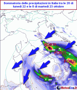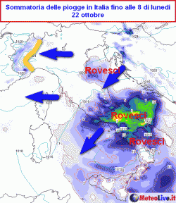 La prima mappa mostra la sommatoria delle piogge fino alle 8 di domani mattina, lunedi 22 ottobre.