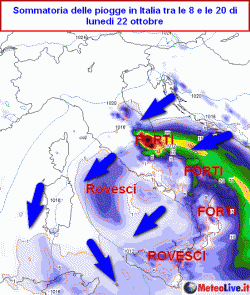 Tra le 8 e le 20 di lunedi 22 ottobre (seconda mappa), avremo forse la fase più dura del maltempo sull’Italia.