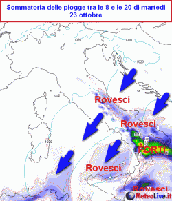 L’ultimo atto del maltempo al meridione si consumerà tra le 8 e le 20 di martedi 23 ottobre (quarta mappa) prima di un generale miglioramento che avverrà nella giornata di mercoledi 24 ottobre.
