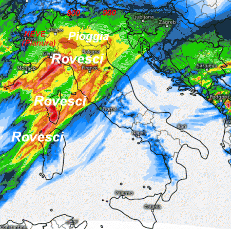 Una depressione posta tra il Golfo del Leone e la Corsica ospiterà un’intensa perturbazione che porterà un grosso carico di pioggia soprattutto sulle regioni centro-settentrionali. La neve, oltre ai settori alpini, potrebbe farsi nuovamente vedere in una prima fase sulle pianure del Piemonte e dell’ovest della Lombardia, per poi lasciare il posto alla pioggia.