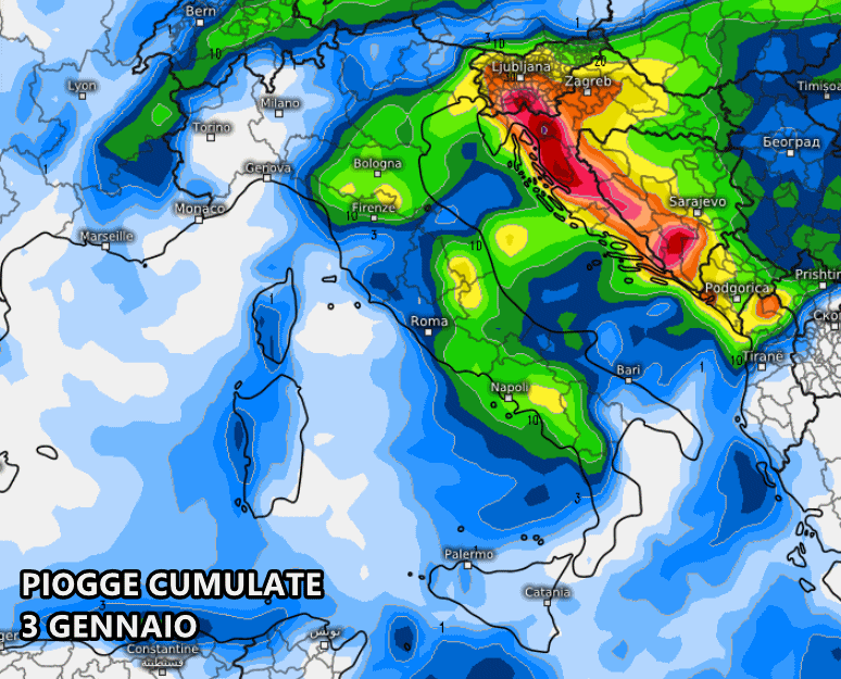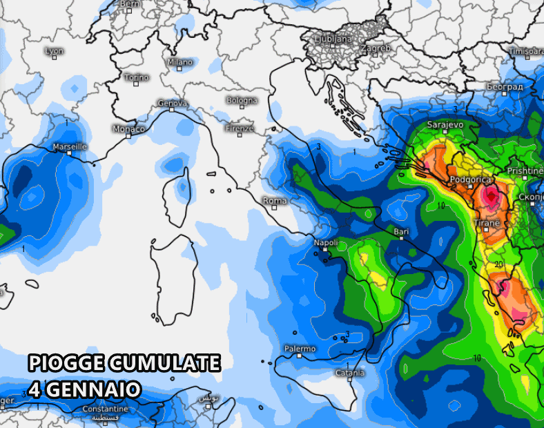 Un primo assaggio di instabilità arriverà tra il 3 e il 4 gennaio, come mostrato dal modello americano GFS, che propone il transito di una veloce depressione accompagnata da rovesci sparsi e alcune nevicate.